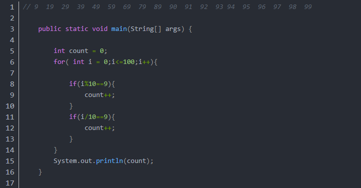 题目内容:编写程序数一下 1到 100 的所有整数中出现多少个数字9