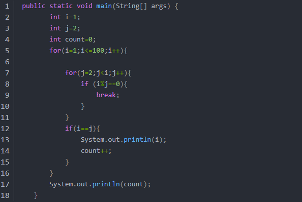 注意点:打印出1-100之间的素数,我们用的是较为简单的做法,还可以更加方便地求解,比如i++ --> i+=2,偶数不可能是素数。还可以将j的范围缩小到 i/2 或者 i开平方.