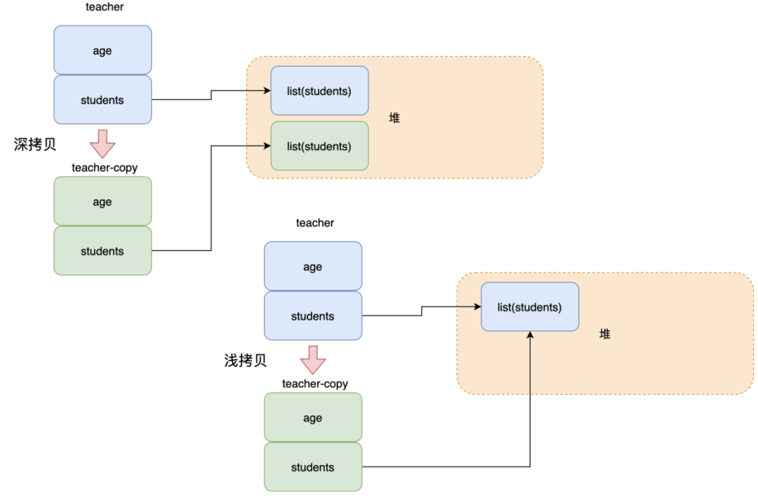 所以假如拷贝的对象成员间有一个 list,深拷贝之后堆内有 2 个 list,之间不会影响,而浅拷贝的话堆内还是只有一个 list。