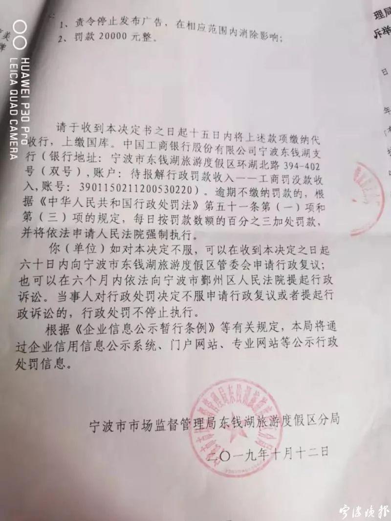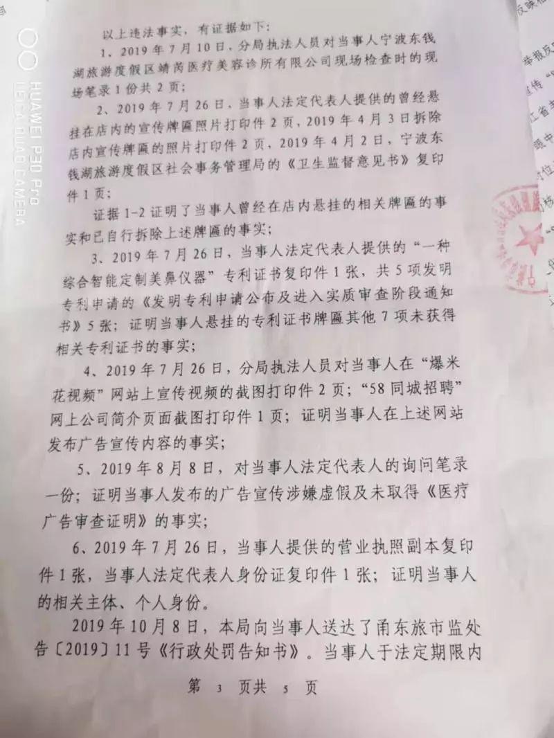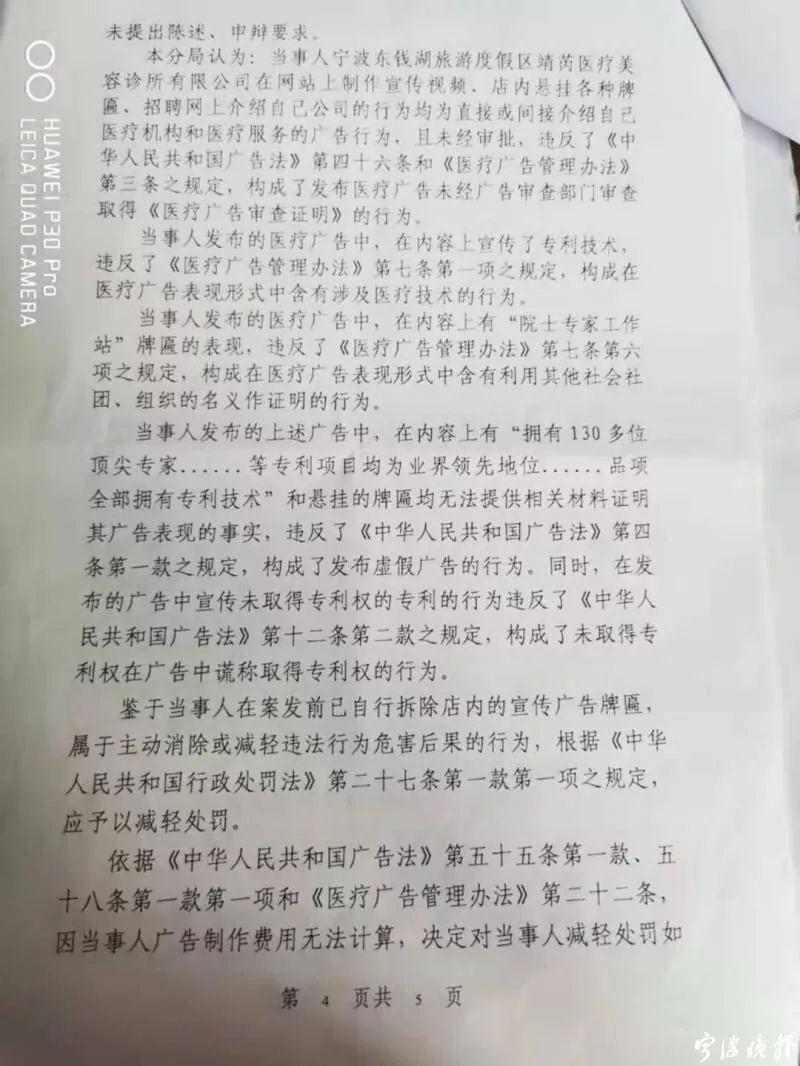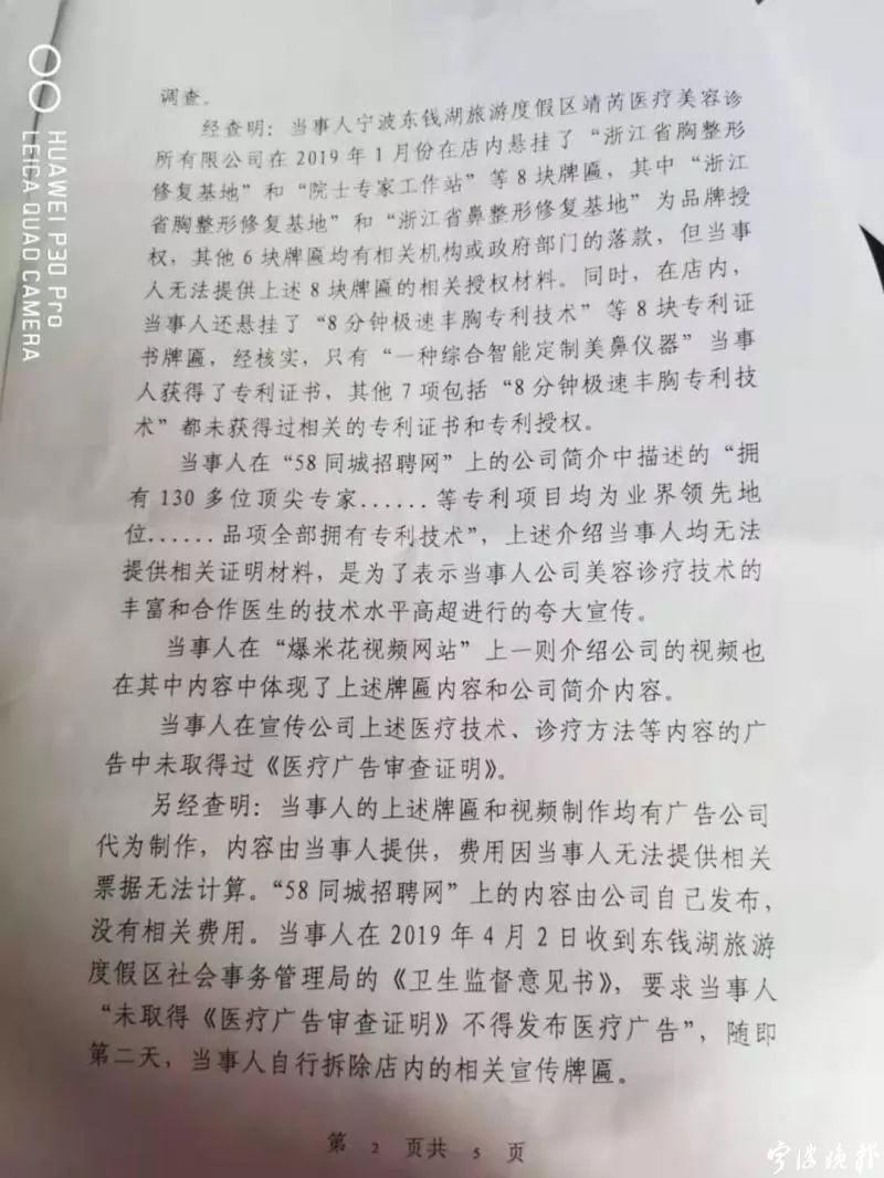 记者注意到,东钱湖市监分局10月12日发布的行政处罚决定书中,认定当事人无法提供“浙江省胸整形修复基地”和“院士专家工作站”等8块牌匾的相关授权材料,经核实“8分钟极速丰胸专利技术”未获得相关的专利证书和专利授权,当事人在宣传上述医疗技术、诊疗方法等内容的广告中未取得过《医疗广告审查证明》……责令其停止发布广告,在相应范围内消除影响,并罚款20000元整。