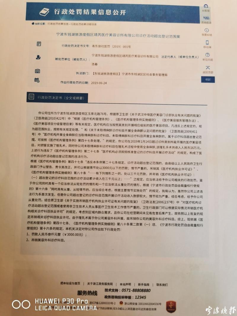 东钱湖社会事务管理局6月24日所做的行政处罚决定中,认定其超范围经营,罚款3000元整并吊销美容外科诊疗。