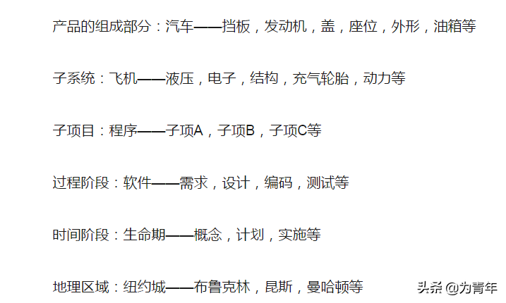 WBS 的分解结构,在许多著名的项目管理书籍里都有介绍和举例说明。