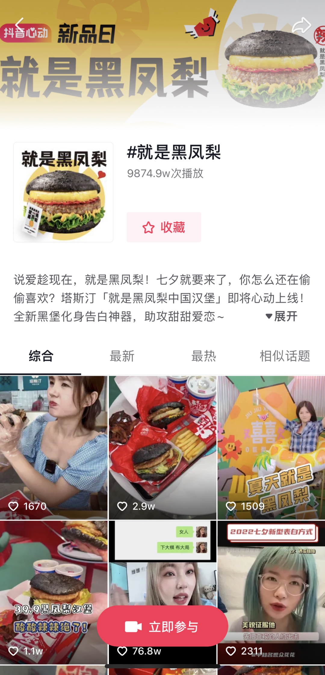 在刚过去的七夕情人节,大多数品牌还在用传统双人套餐吸客时,塔斯汀把目光投向了拥有6亿日活用户的抖音平台,联合抖音生活服务IP活动“抖音心动新品日”,推出七夕新品“就是黑凤梨中国汉堡”,成为餐饮七夕营销的一匹黑马!