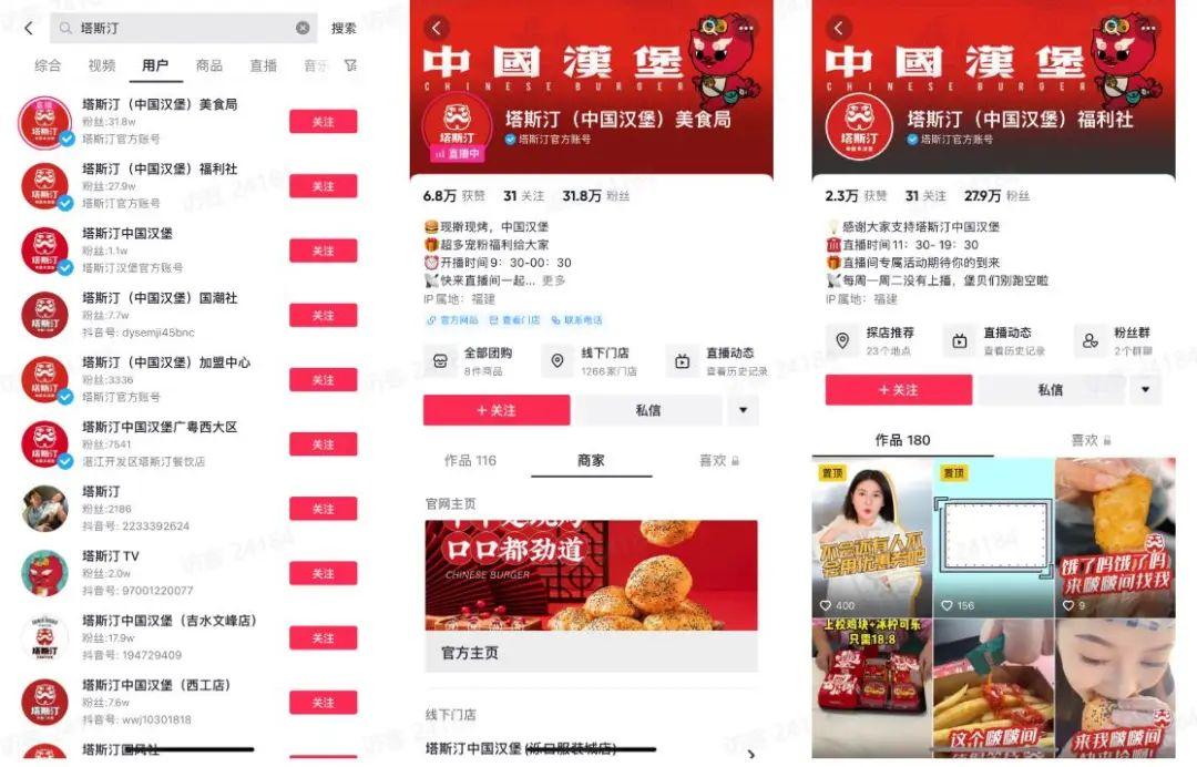 账号运营:塔斯汀在抖音运营多个矩阵账号,并于从今年4月开始进入快速涨粉期,目前“塔斯汀(中国汉堡)美食局”、“塔斯汀(中国汉堡)福利社”粉丝量30w左右,其中定期的常态化直播成为粉丝增长的重要来源。