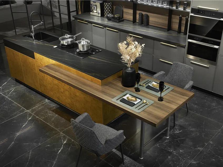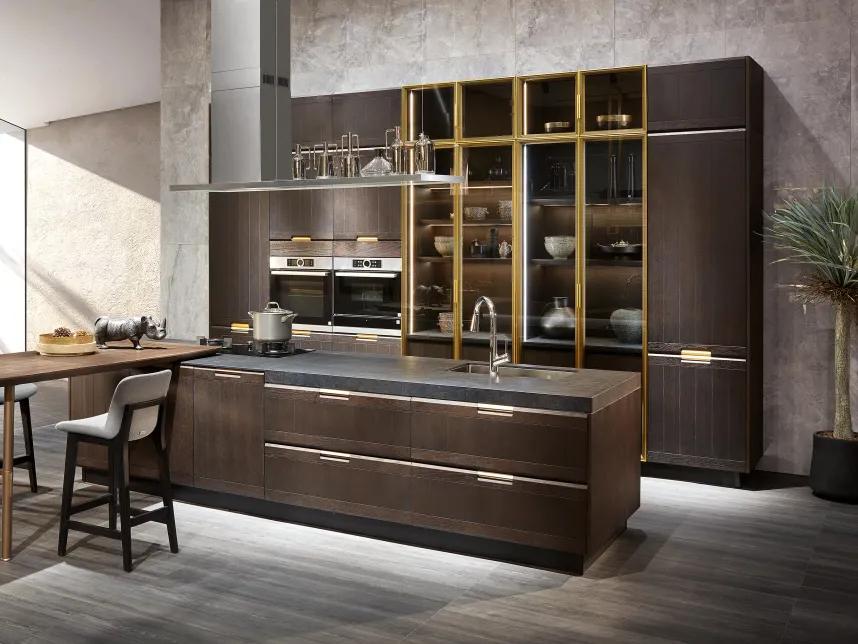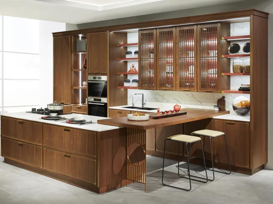 古色古香的搭配,温暖的灯光、柔和的色彩,与深色胡桃木或黑胡桃木等材质纹理相搭配,完美演绎现代东方美学艺术。将鎏金线条,描摹在门板边缘,颇为厨房增添了几分雕栏画栋的意境之趣。