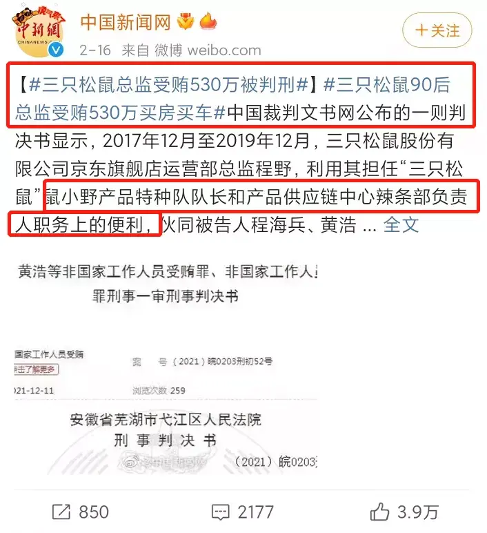 就在这两天,三只松鼠被曝出90后高管受贿530万,加上另一名90员工受贿188万,入狱三年。
