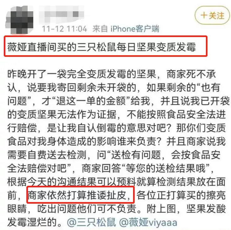 去年双十一后,很多人在薇娅直播间买到的三只松鼠坚果,出现了不同程度的变质发霉,还闹上了微博热搜。