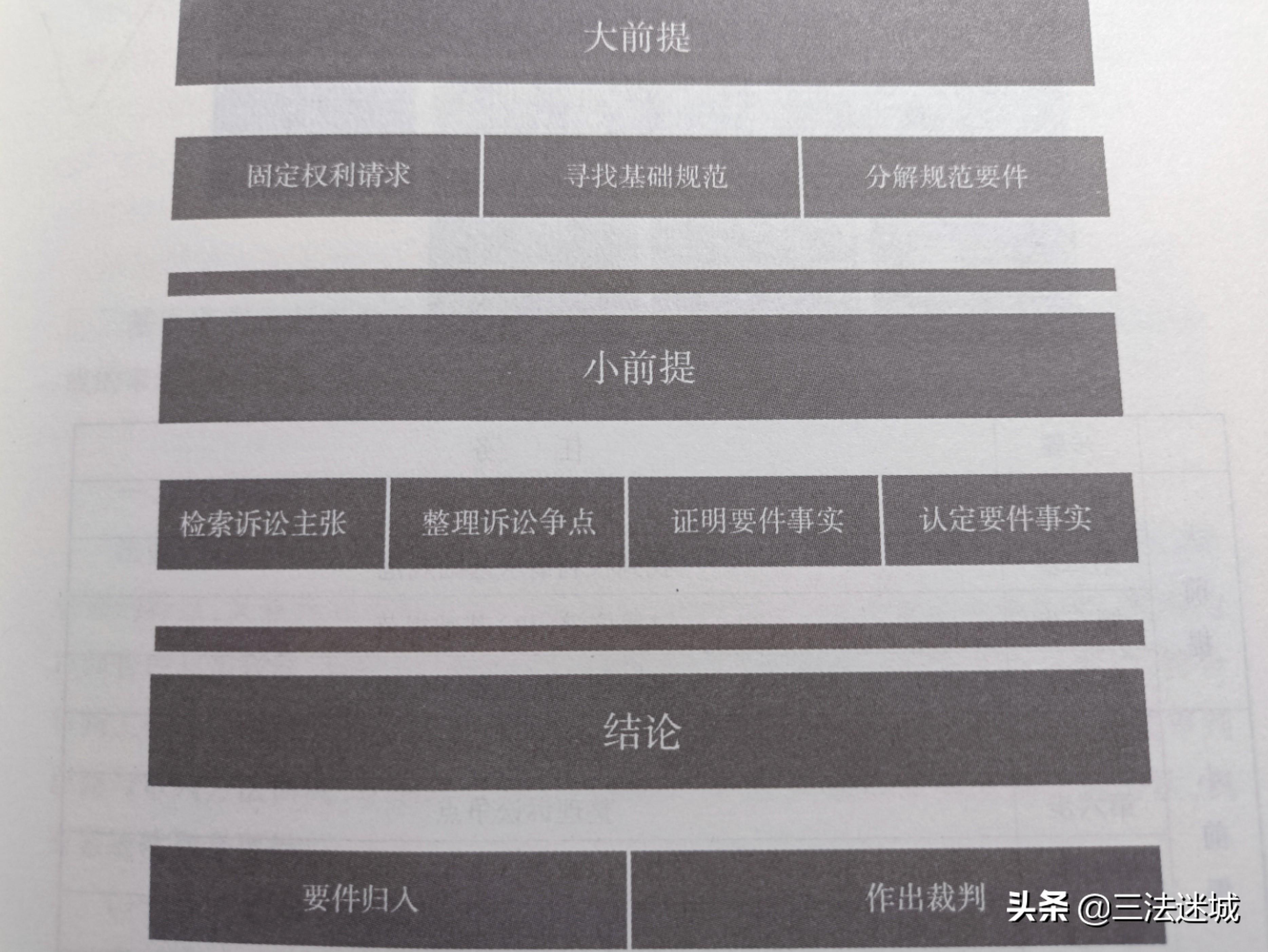 大前提(首先确定应当依据的法律条文)——小前提(案件事实是否符合法律的构成要件)——结论