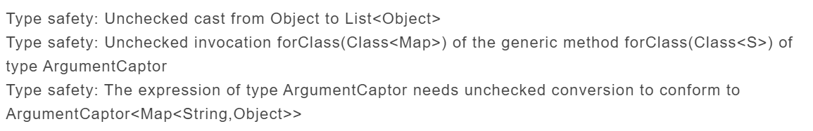 }在编写测试用例时,特别是泛型类型转换时,很容易产生类型转换警告。常见类型转换警告如下:
