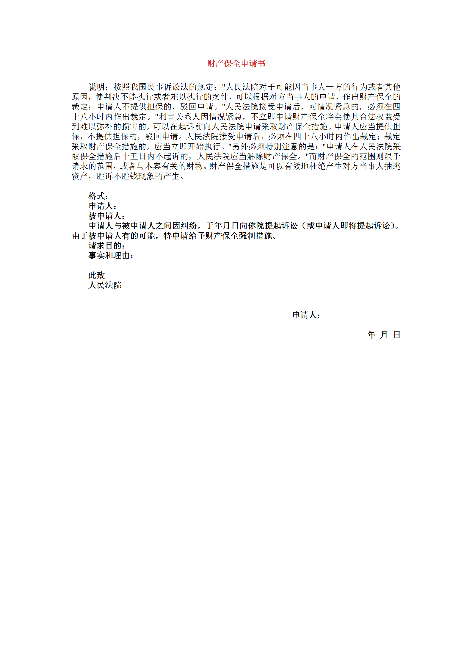 申请人与被申请人之间因纠纷,于年月日向你院提起诉讼(或申请人即将提起诉讼)。由于被申请人有的可能,特申请给予财产保全强制措施。