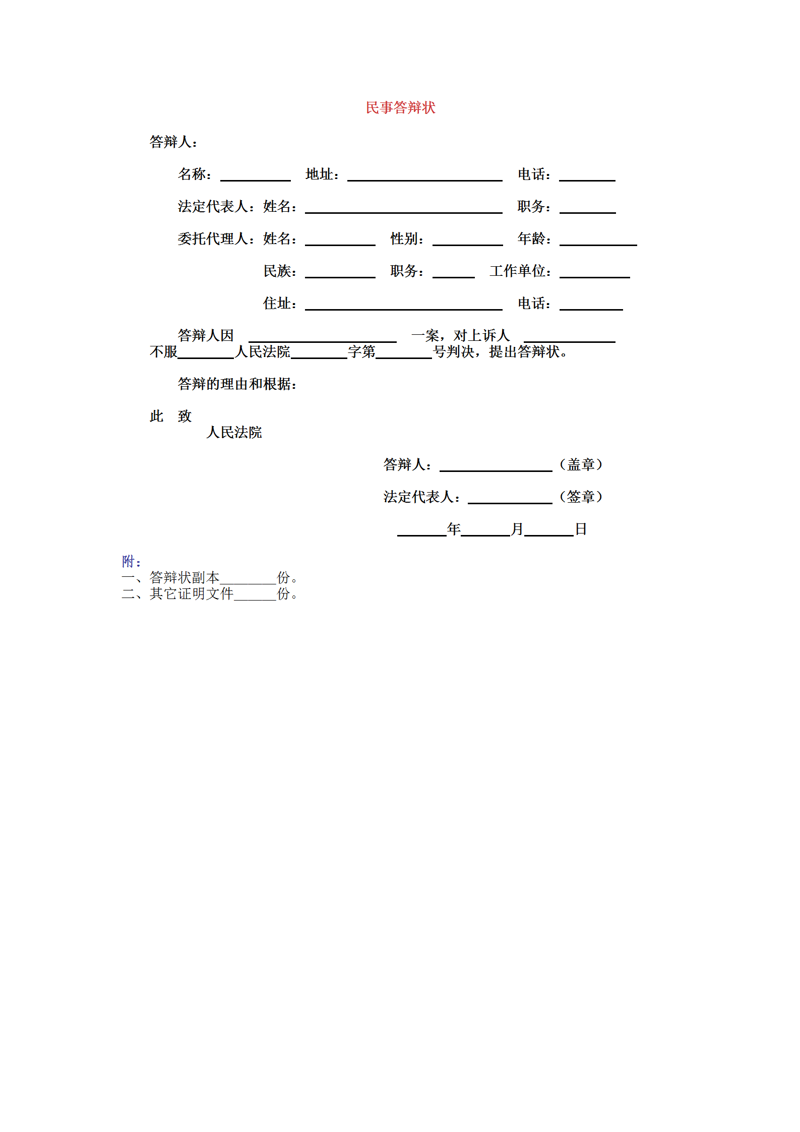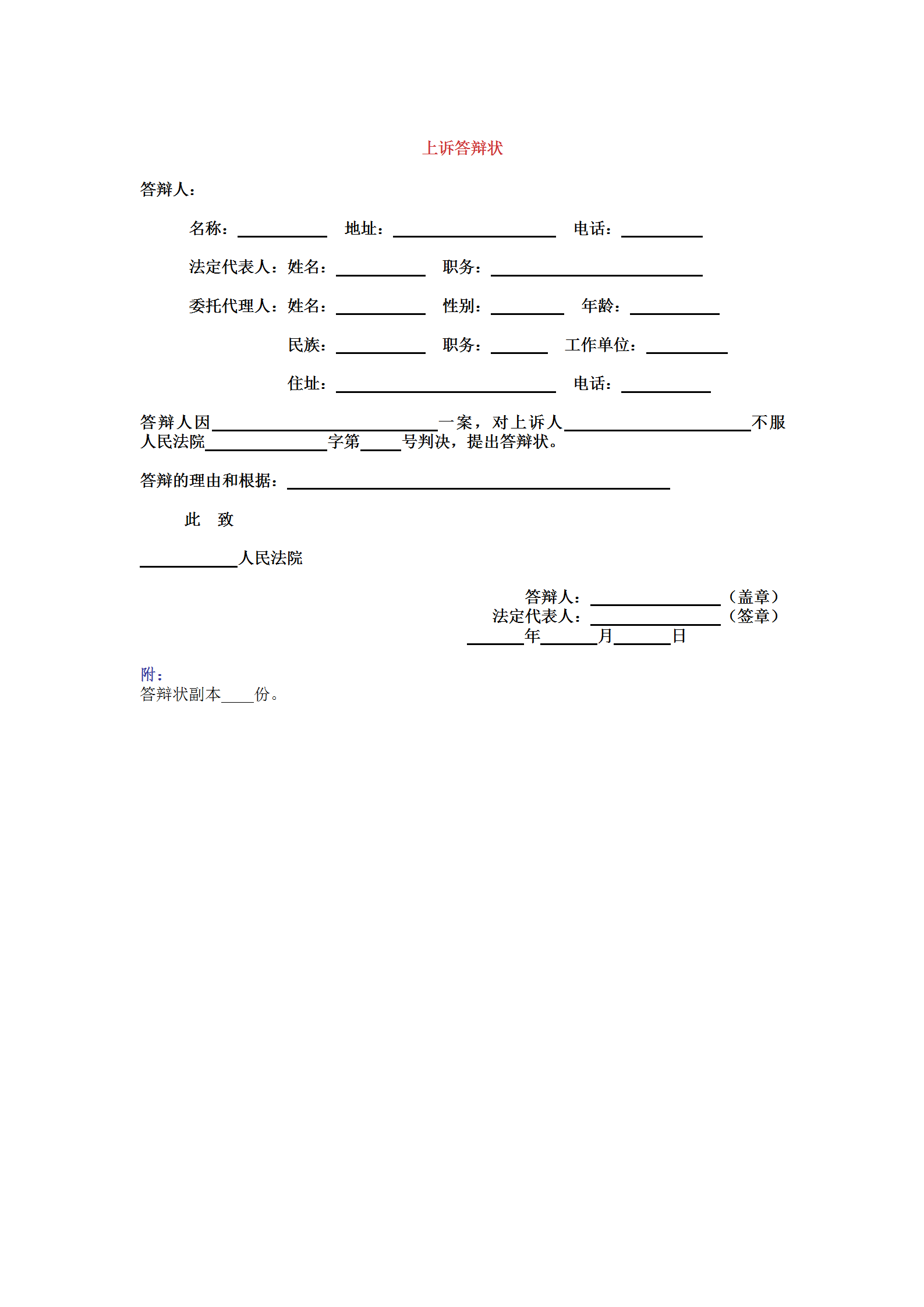 答辩人因 一案,对上诉人 不服 人民法院 字第 号判决,提出答辩状。