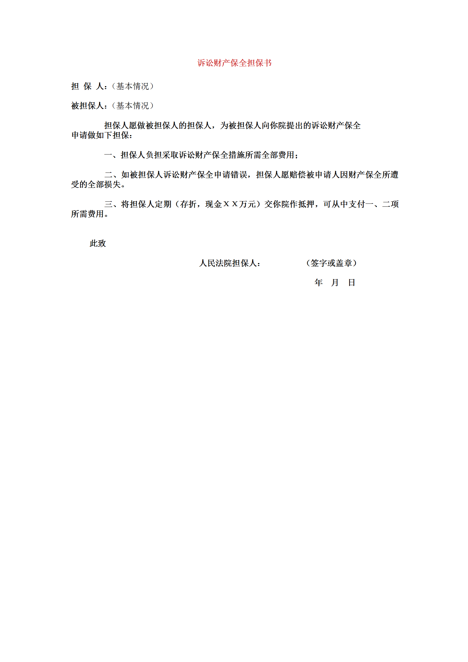 二、如被担保人诉讼财产保全申请错误,担保人愿赔偿被申请人因财产保全所遭受的全部损失。