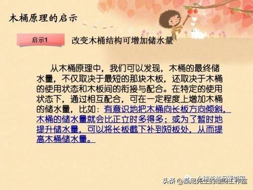 根据木桶理论的核心内容,还可以得出两个推论:其一,只有桶壁上的所有木板都足够高,那水桶才能盛满水。其二,只要这只水桶里有一块不够高度,水桶里的水就不可能是满的。
