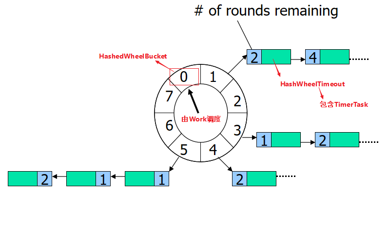 Worker:worker工作线程主要负责任务调度触发,单线程运行。HashedWheelBucket: 时间轮上面的格子,内部持有HashedWheelTimeout组成的链表结构的头尾节点,多个格子组成的时间轮形成一圈又一圈的任务环HashedWheelTimeout: 往时间轮里面提交的任务会被封装成HashedWheelTimeout