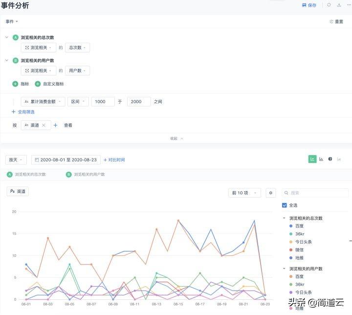 定义事件:将事件定义为PV值,通过筛选条件限定渠道多维度下钻分析:将PV值按照日期、地理位置、机型、操作系统、IP等不同维度进行分析通过多维度展示结果,给出PV数据的解释,是虚假流量?(全部来自某IP),数值异常高?(某天数据上涨)干啥的:分析用户参与情况/活跃程度,考察进行初始行为的用户中有多少人会进行后续行为。这是用来衡量产品对用户价值高低的重要方法。