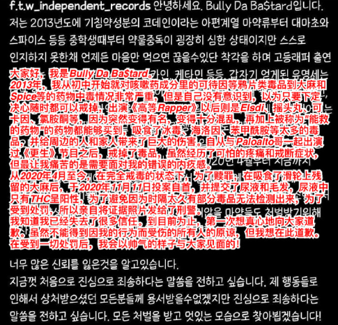 11月14日,据韩媒报道,韩国饶舌歌手Bully Da Ba$tard(本名尹炳浩)13号晚上在社交平台上自曝,从读初中的时候就开始吸毒,现在他决定自首,并向广大粉丝表达歉意。