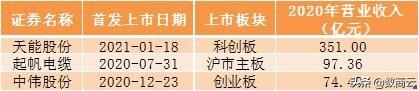 据IPO日报初步统计,在近一年的时间内,电气机械和器材制造业共有31家企业登陆A股。在这31家新股中,2020年营业收入最高的前三名分别是天能股份、起帆电缆、中伟股份。其中,天能股份去年的营业收入为351.00亿元,与二、三名企业形成大断层高居榜首,且天能股份的扣非后归母净利润为20.25亿元,也是上述31家企业中盈利最多的,随后是起帆电缆的3.77亿元。