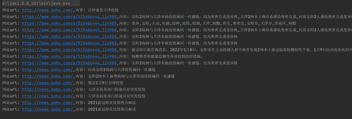 public class SpiderService {public final static String REQUEST_URL = "http://news.sohu.com/";public final static String KEYWORD = "^.*疫情.*#34;;public static Integer count = 0;public static void spider(String url) throws Exception {URL requestUrl = new URL(url);URLConnection urlConnection = requestUrl.openConnection();BufferedReader bufferedReader = new BufferedReader(new InputStreamReader(urlConnection.getInputStream()));String input = bufferedReader.readLine();while(input !=null && count<1000 ){Pattern p = Pattern.compile(KEYWORD);Matcher m = p.matcher(input);while(m.find()) {count++;String matchContent = m.group();String url1 = getUrl(matchContent);if(!StringUtils.isEmpty(url1)){spider(url1);}else{String value = getValue(matchContent);System.out.println("网址url: "+url+",内容: "+value);}}input = bufferedReader.readLine();}}private static String getUrl(String matchContent) {String regex = "href=\"(http|https://.*?)[\"\\s]";Pattern p = Pattern.compile(regex);Matcher m = p.matcher(matchContent);String content = null;//会存在多个链接,可以用个集合进行存储,这边就简单展示 只取一条if(m.find()){content = m.group(1);}return content;}private static String getValue(String matchContent){String regex = "[\\w,,.。\\f\\t\\v\\u4e00-\\u9fa5]*疫情[\\w,,.。\\f\\t\\v\\u4e00-\\u9fa5]*";Pattern p = Pattern.compile(regex);Matcher m = p.matcher(matchContent);String content = null;//会存在多个内容,可以用个集合进行存储,这边就简单展示 只取一条if (m.find()){content = m.group();}return content;}public static void main(String[] args) throws Exception {spider(REQUEST_URL);}}