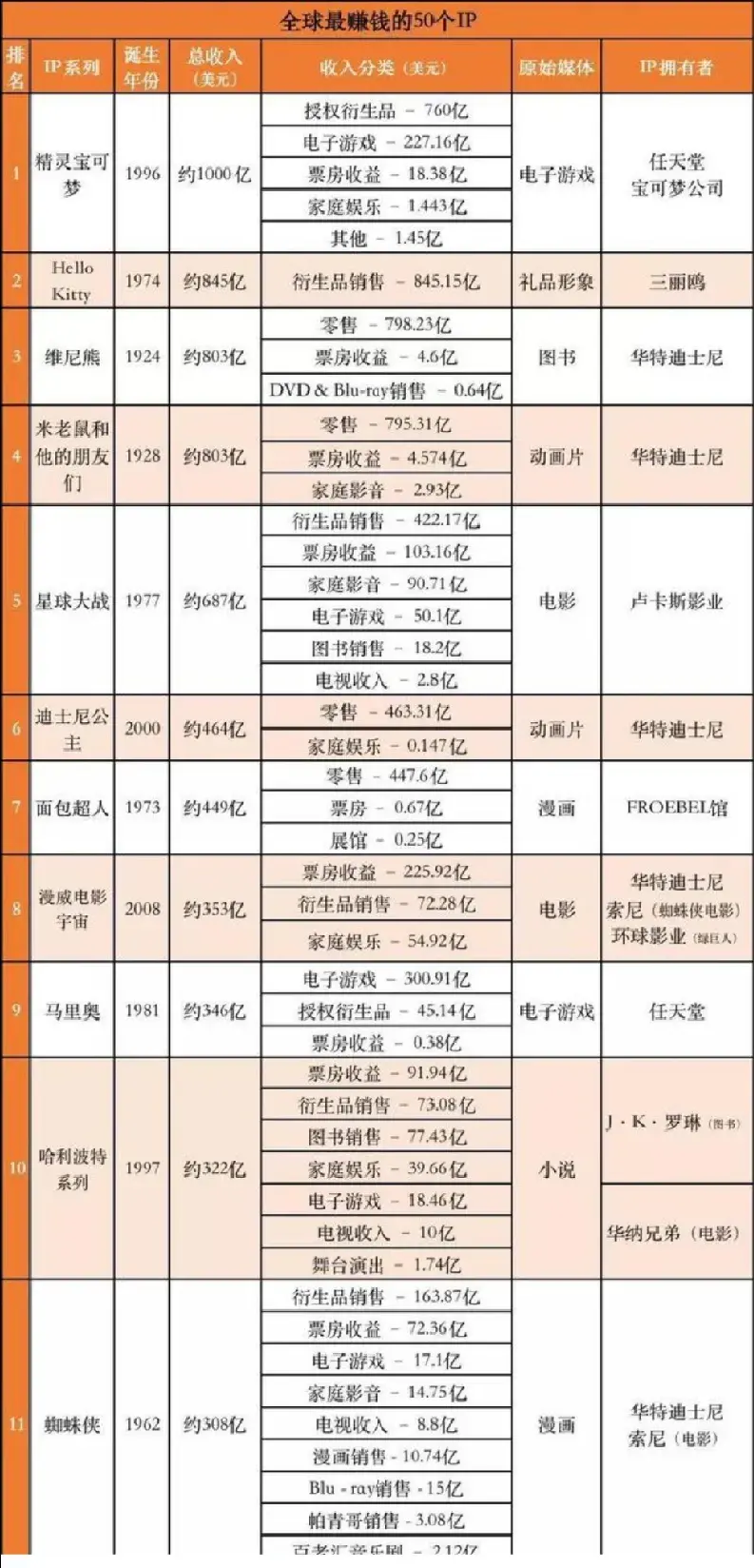 看看这些IP有多赚钱。2021年3月5日,WikiMili根据上市公司财务数据、全球第三方权威数据统计平台等,汇总得出了全球最赚钱的50个IP。