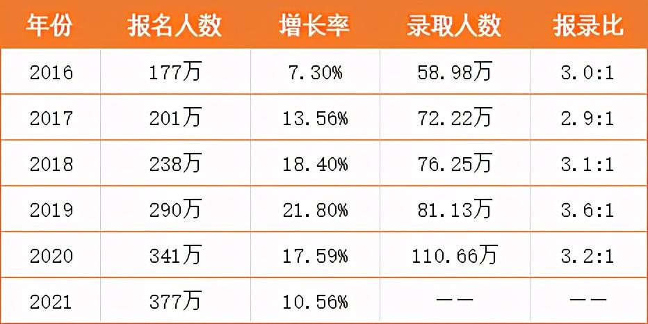由下图可知,每年报考人数都在不断创新高,预计2022年研究生报考人数达到400万,且每年院校招收比例幅度和国家录取分数线变动较小,报考非全的难度会明显提高,这也正是为了选拔具有一定实践经验的优秀在职人才。