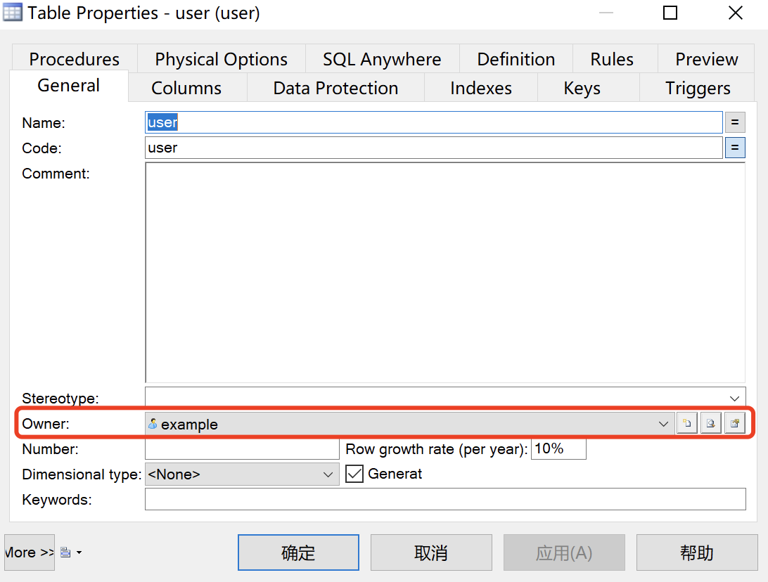设计表的时候,注意设置表的Owner,之后我们将把Owner的名称作为生成脚本的文件名,这里通常可以写成你的数据库名: