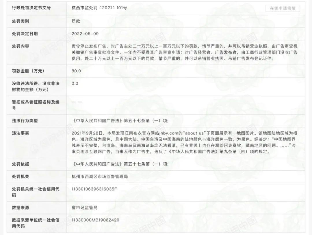 5月31日,新京报贝壳财经记者在信用中国官网获悉,5月9日,江南布衣服饰有限公司(以下简称“江南布衣”)因发布损害国家尊严的广告,被杭州市西湖区市场监督管理局罚款80万元。