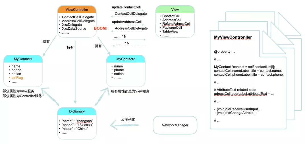 MyViewController需要为ContactCell更新它的各种相关属性,类似的还有AddressCell、PackageCell等。MyViewController在更新AddressCell展示前,可能还需要先为它计算出合适的富文本展示内容。MyViewController需要响应不同Cell的点击交互行为,包含但不限于按钮点击、输入框变化、富文本跳转、键盘起落等。MyViewController需要响应CollectionView/TableView的DataSource/Delegate各种方法实现。MyViewController需要响应Model层的变更通知,或者是另外一个ViewController抛过来的广播通知。……然后MyViewController就爆炸了。