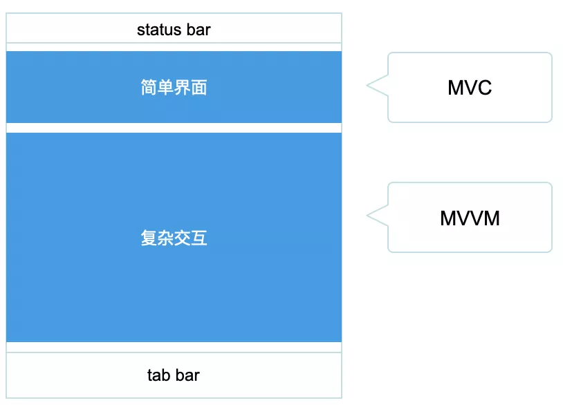 架构是一个名词(n.)+动词(v.)。架构(n. & v.)是为了帮助 开发者在交流时有一致的理解、在业务需要时能够便于扩展、在出问题时能够快速定位等等(对抗熵增)。具体还是看采用这个架构的得失,要解决什么问题或带来什么好处,然后带来什么成本或付出什么代价。架构(v.)通过分配每部分代码的职责并为他们取名(好比iOS/Android开发工程师这样的岗位名称,让别人一看就知道是做什么的),然后几个名字加在一起 形成了架构模式这个抽象概念。从具体到抽象,然后再由这个抽象概念去指导程序员实践写代码,促进了架构的传播,比如MVC、MVP、MVVM、MVVM-C、MVI、MV-Whatever,VIPER,Redux and More……有时候并不一定是架构模式的错,还有可能是平台/框架在让架构模式自传播时采用的具体方案出了点问题,又或者是开发者自己写代码的问题。有时候架构模式之间也不是互斥的,也可以在不同场景下互补。比如在MVC里,每个业务表现模块不一定要有三个元素齐聚,甚至也可以 VC-M-VC 共用一个M(可参考斯坦福iOS开发课程内容)。有一个实际的业务场景是这么实践的: