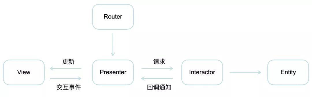 VIPER概念由View、Interactor、Presenter、Entity、Router几个元素组成,大致如下:
