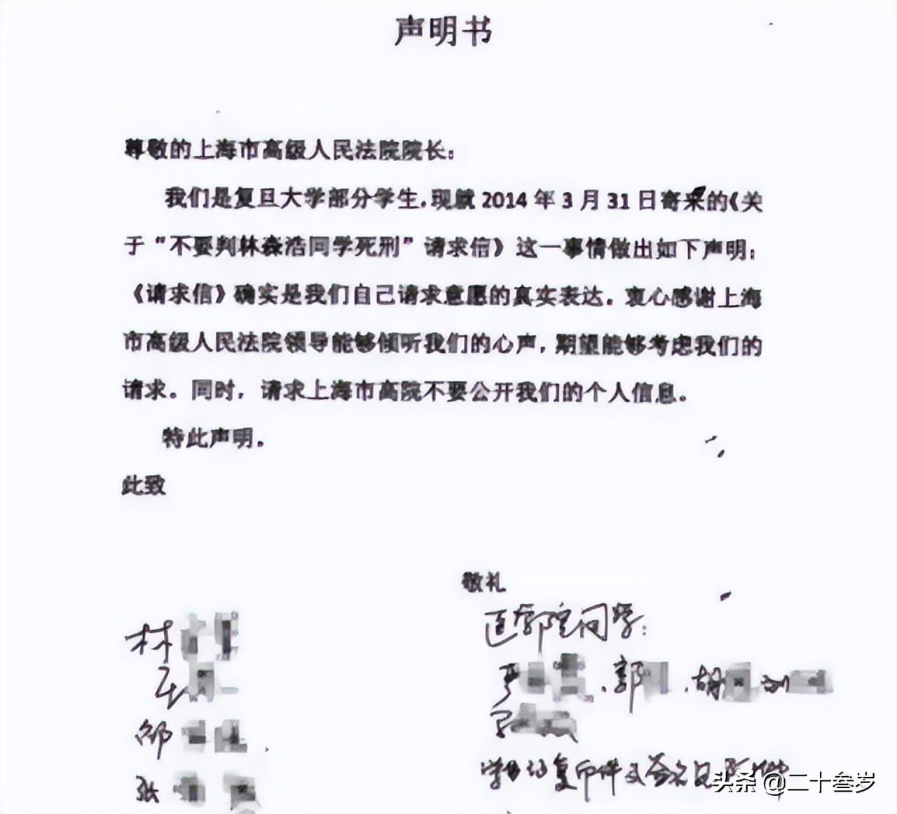 2014年5月,复旦大学177名师生发布《关于不要判林森浩“死刑”请求信》联名信,请求上海高院在国家当前少用死刑的背景下,给予林森浩一个赎罪机会,慎杀、少杀。
