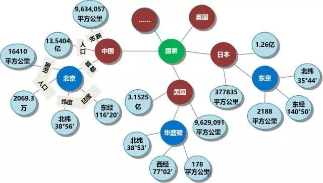 三元组也被称为“一条语句”,或知识图谱中的一条知识。在图4的国家信息关系三元组中,我们就可以读出一条语句(或是知识)为:“中国的土地面积有9,634,057平方公理”。