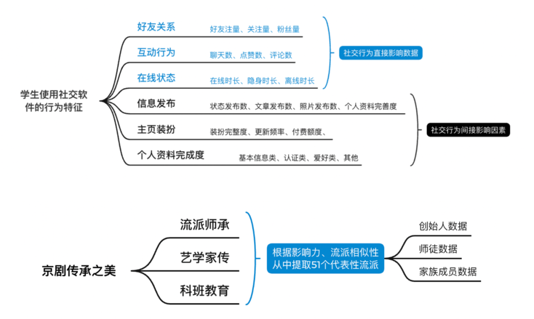 比如,在“学生使用社交软件的行为特征”这个主题中,可定义“学生(实体)-网络社交特征(属性)-具体行为(属性值)“是一组关系结构,体现在数据为“张三-在线时长-5小时/天”,描述成知识语意为:张三同学社交软件每天会在线亮起5个小时;