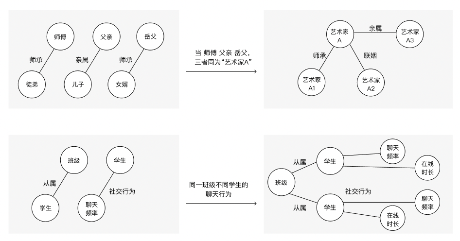 比如京剧文化中师承的演变,可以通过不同人物之间的关系脉络,构建出“师承关系、家族关系、联姻关系”几种三元组模式,从相同节点中解读到某个京剧演员擅长某个角色的师承因素。