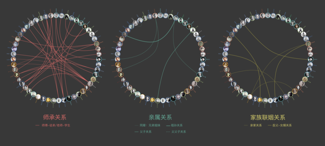 主体采用和弦图,人物点构成和弦图的圆,人物关系类别采用不同颜色线条进行连接。根据人物出生时间的向性特点,将人物按照某一方向进行排列,即可隐喻师徒或者亲属关系的有向性。采用树形图形式的线条表达主次人物的关系。将几种基础关系做好映射后,再把相关节点整合在一起,就表达了整体的师承关系结构图,最终形成“传承之美”整体的可视化知识图谱。