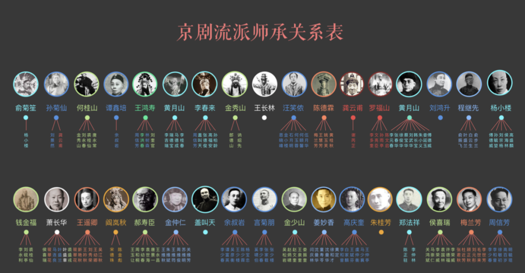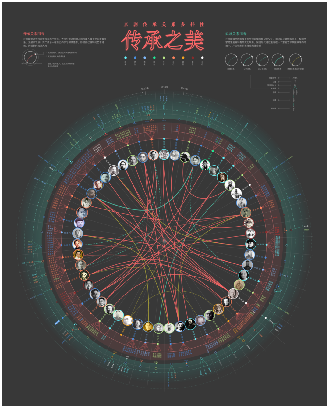 例如,“京剧传承之美”的数据选择过程中,作者对京剧艺术传承上存在的“流派师承、艺学家传、科班教育等”多种方式进行进行分类和筛选,最终提取了京剧51个流派的创始人数据、师徒数据、家族成员数据。