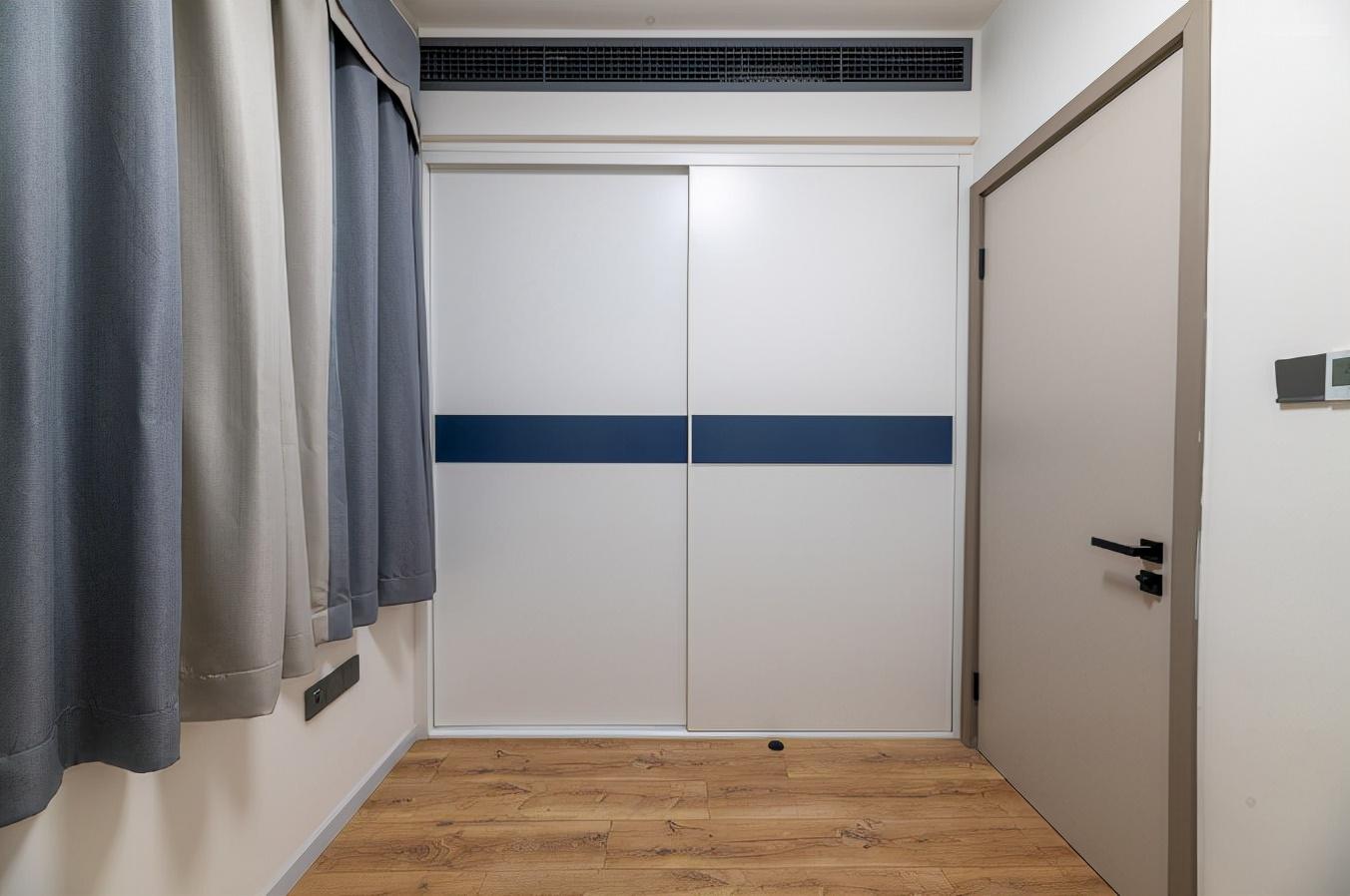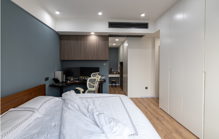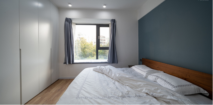 主卧延续了沙发背景墙的用色,利用蓝色与白色的碰撞,营造出一种温馨静谧的氛围,有助于改善睡眠。床尾部空间,设计了一整排的衣柜,无明装门把手设计,整洁美观。