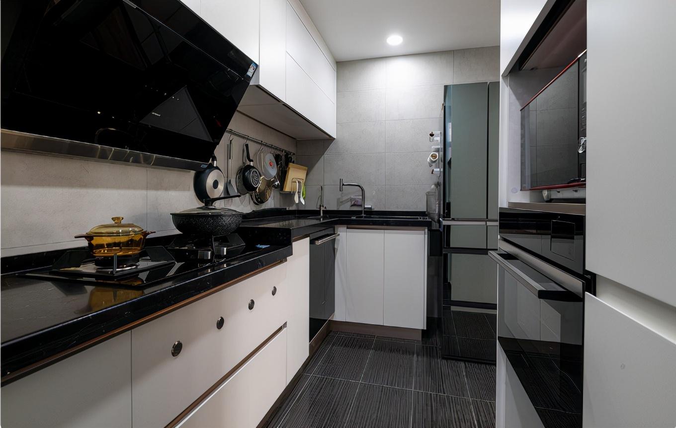 厨房黑白色定调,简约耐脏好清洁。厨房用具尽量收纳上墙,实现台面空无一物,日常好清洁,看着也不凌乱。冰箱紧挨着水槽摆放,实现最短动线。高低操作台设计,更符合人体工程学,让厨房使用更轻松。