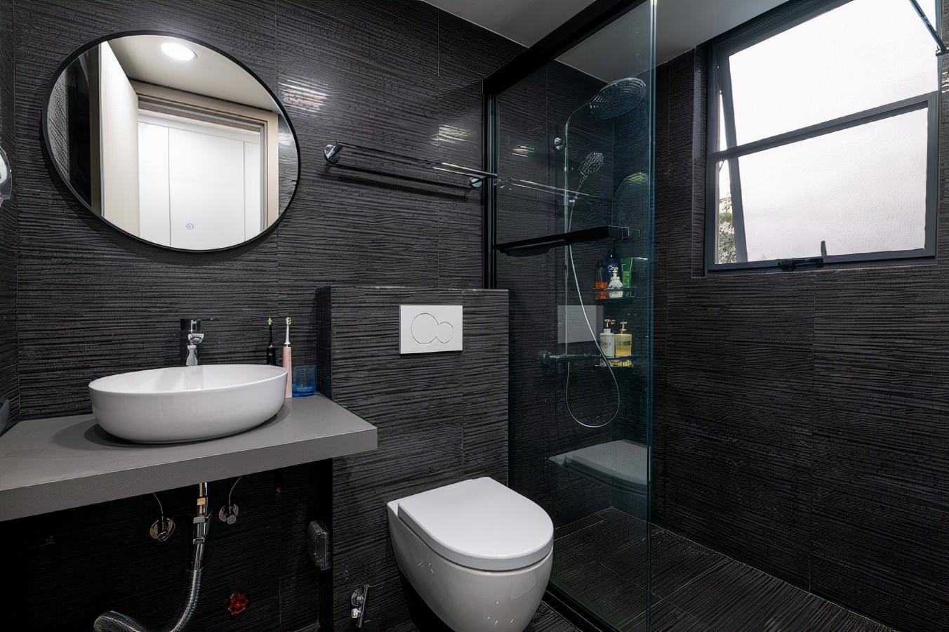 卫生间灰色为主,白色洁具的点缀,空间不至于太过单调。做了干湿分离设计,方便日常使用。