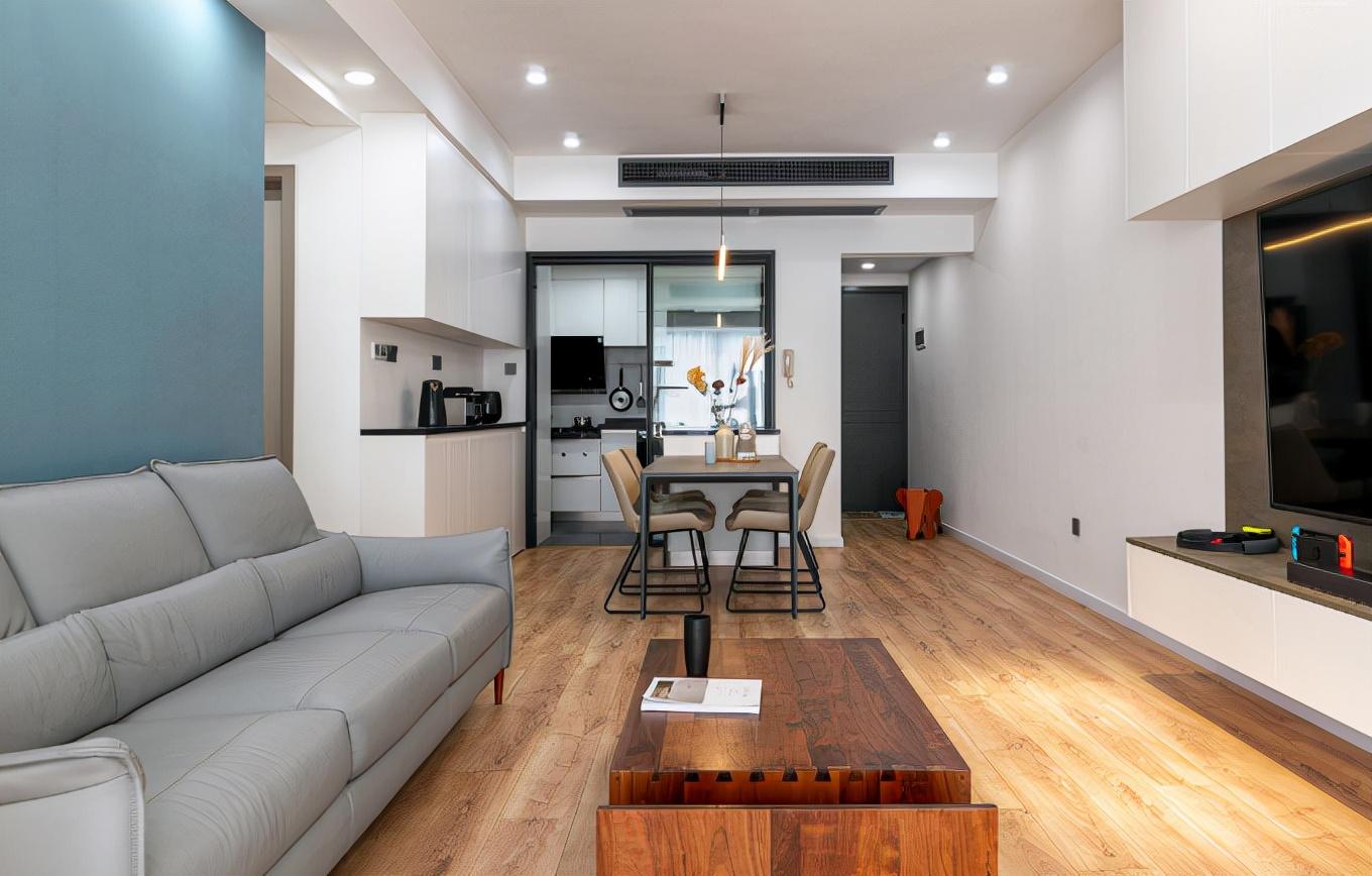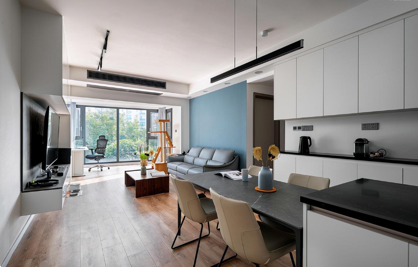 改造后的客厅,阳台的纳入使得空间开阔不少,加上大面积使用白色,整体敞亮很多。沙发背景墙采用蓝色,不仅起到点缀作用,也让黑白灰为主的现代风格多了一丝温馨。电视柜采用悬空设计,视觉效果轻盈也方便扫地机器人工作。