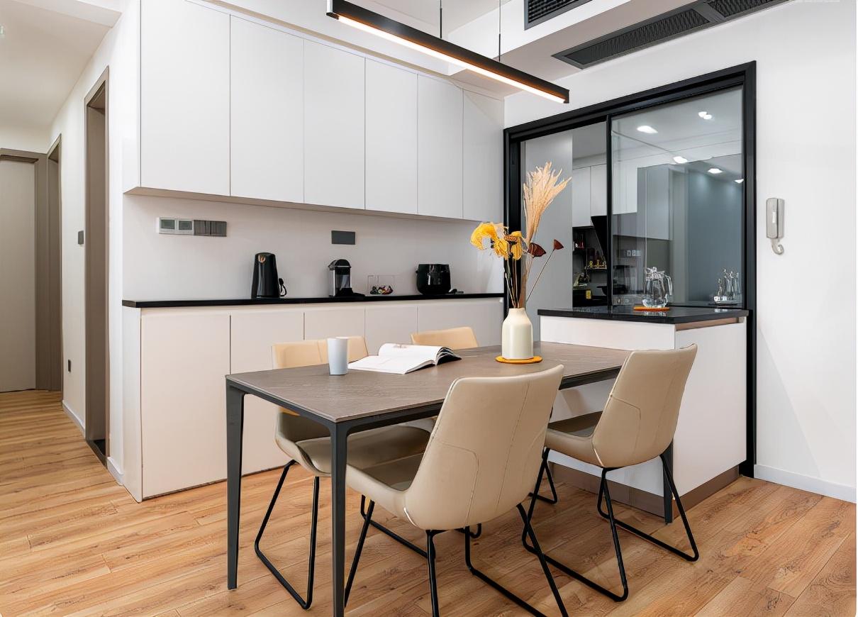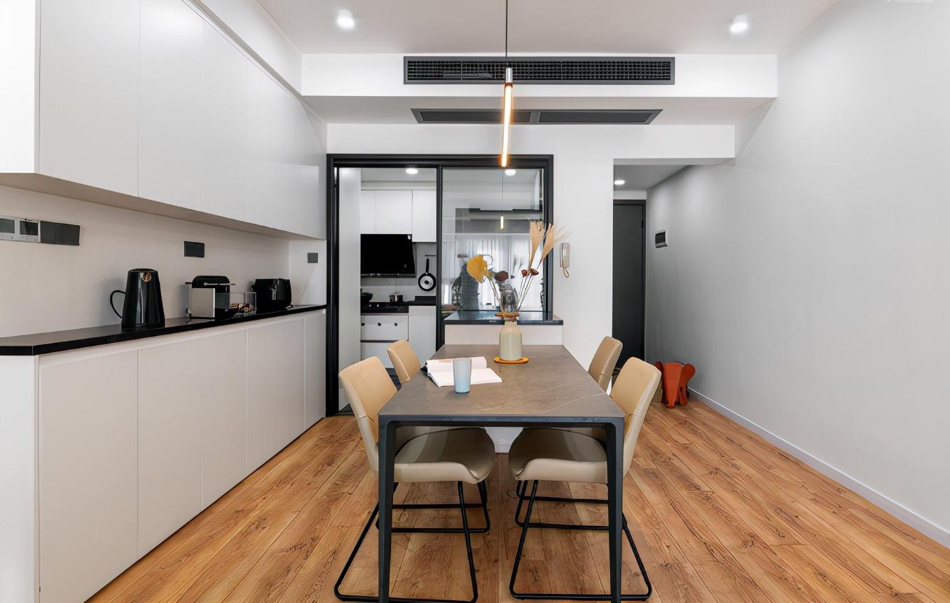 餐厅简单实用,颜色集中在黑白灰三色,极简线条让空间显得干净利落。超大餐边柜设计,为餐厅提供了足够的收纳空间。餐边柜采用上中下三层设计,中间开放式设计,方便摆放常用物件和小电器。