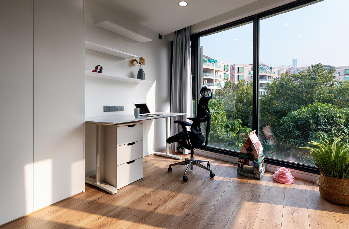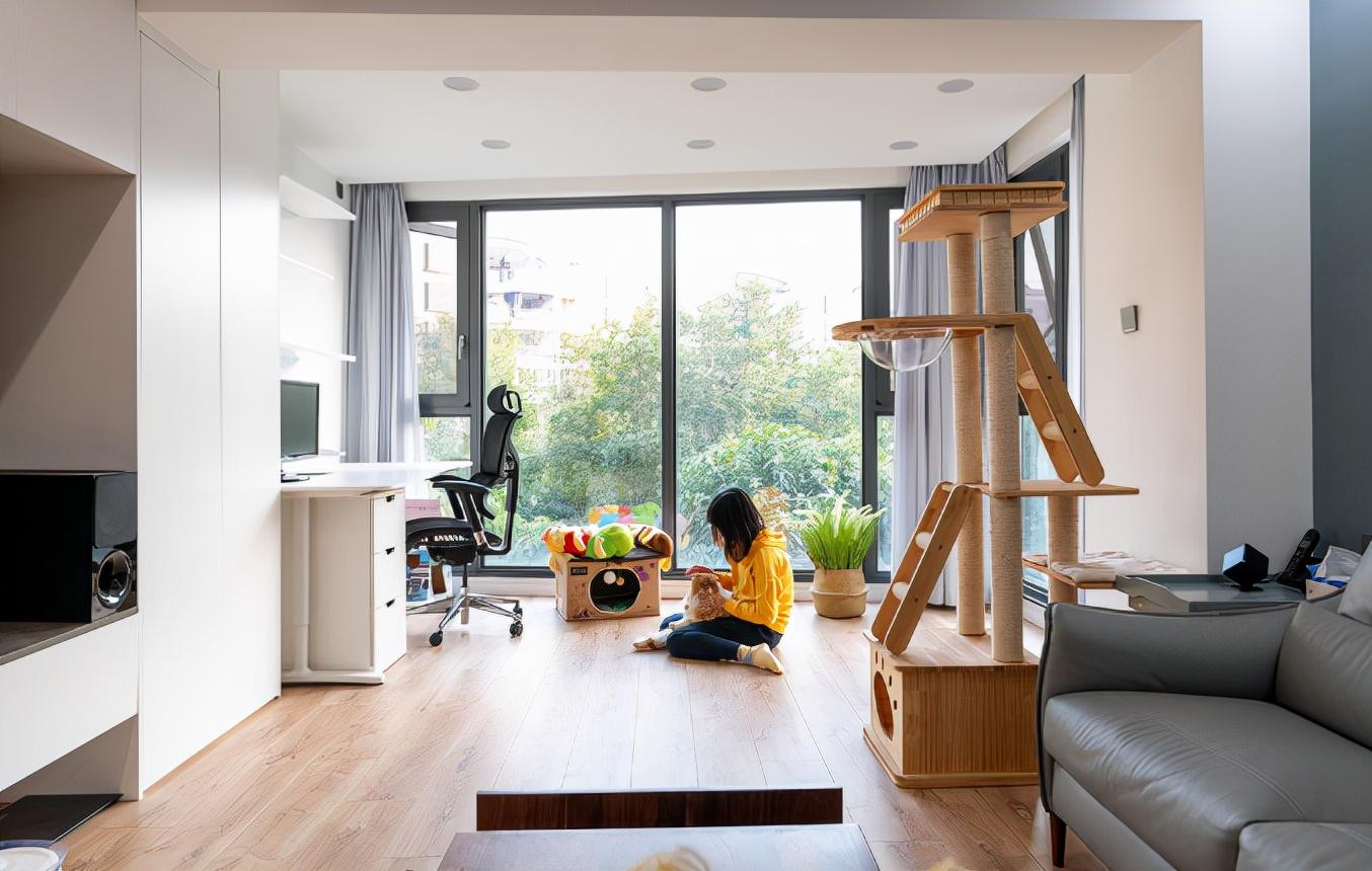 原本的阳台,改造后变成了工作区,日常办公、撸猫两不误。阳台做了封闭处理,大面积玻璃窗设计,不仅提供了更充足的采光,还有窗外的景致。