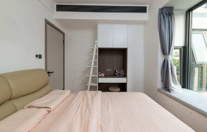 调整了主卧门的位置,提高了卧室使用面积,也让过道空间不那么浪费。带有独立卫生间的主卧,利用进入卫生间的过道尽头,设置了梳妆台。