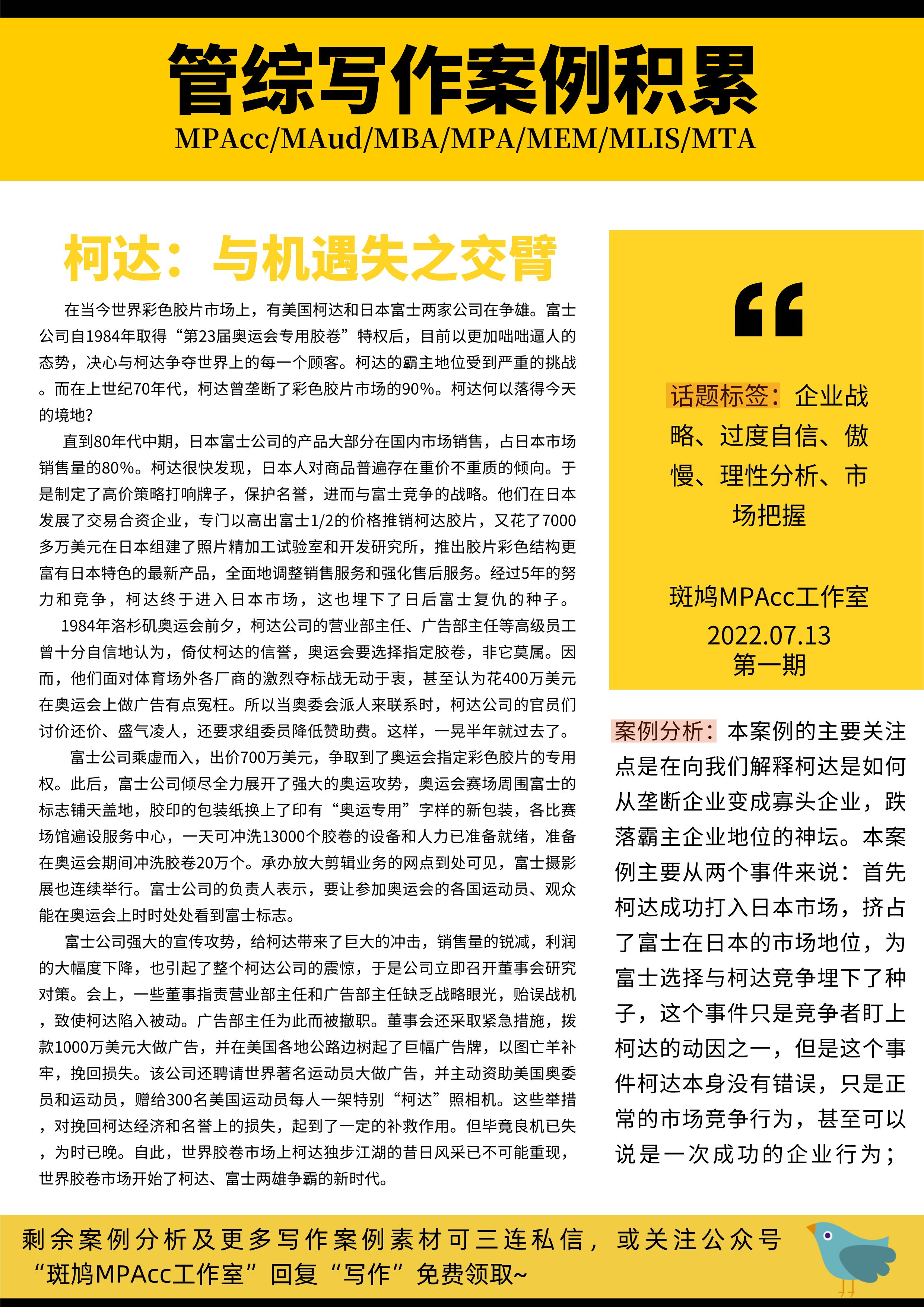 本案例的主要关注点是在向我们解释柯达是如何从垄断企业变成寡头企业,跌落霸主企业地位的神坛。本案例主要从两个事件来说,首先柯达成功打入日本市场,挤占了富士在日本的市场地位,为富士选择与柯达竞争埋下了种子,这个事件只是竞争者盯上柯达的动因之一,但是这个事件柯达本身没有错误,只是正常的市场竞争行为,甚至可以说是一次成功的企业行为;其次第二个事件是在1984年的洛杉矶奥运会中,柯达由于自己傲慢,自恃垄断企业的地位,对奥运会夺标战无动于衷,丢失赞助机会,拱手让与了竞争对手富士公司,自此柯达失去了其垄断地位,事后的抢救措施也为时已晚,世界胶卷市场形成寡头竞争的格局。