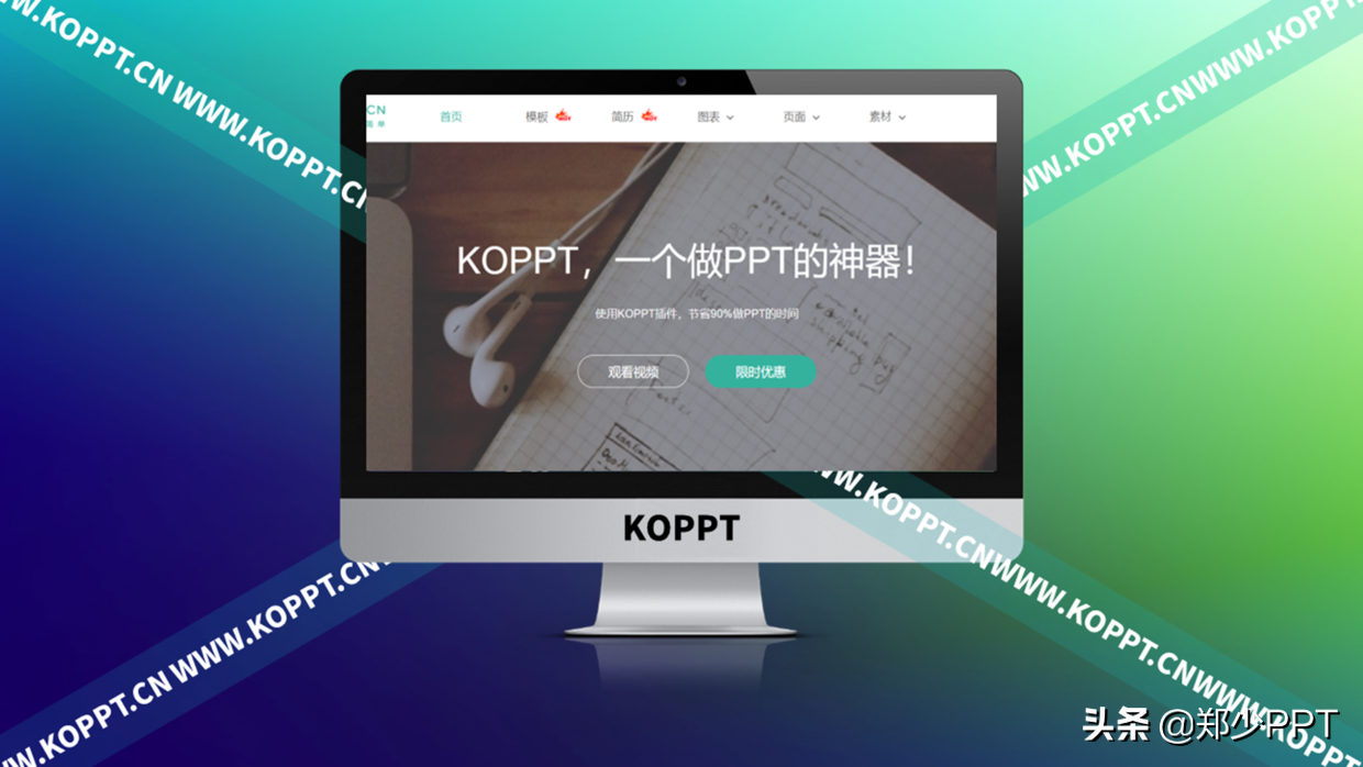 KOPPT这款神器,一开始只是一个网站,素材也很丰富(模板、简历、结构图、逻辑图、图文排版、数据图表、四大页面、创意元素、背景、配色等)。