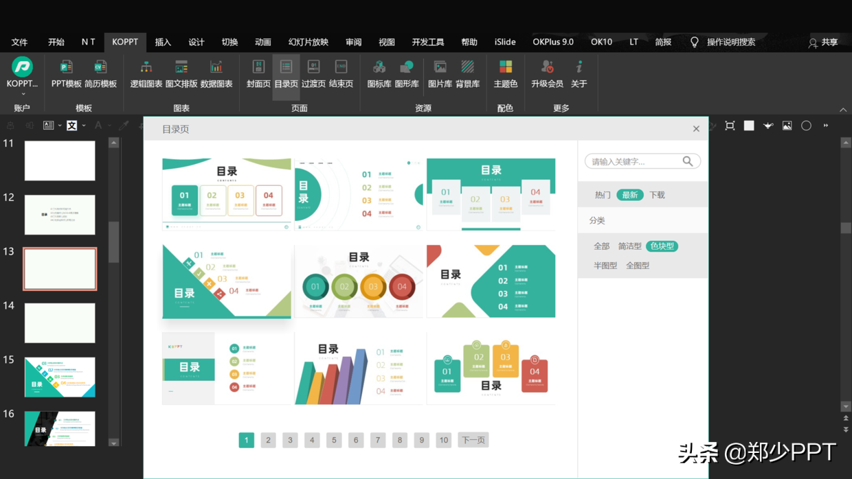 比如,这里选择一个色块型和半图型目录页,直接插入到PPT里面。