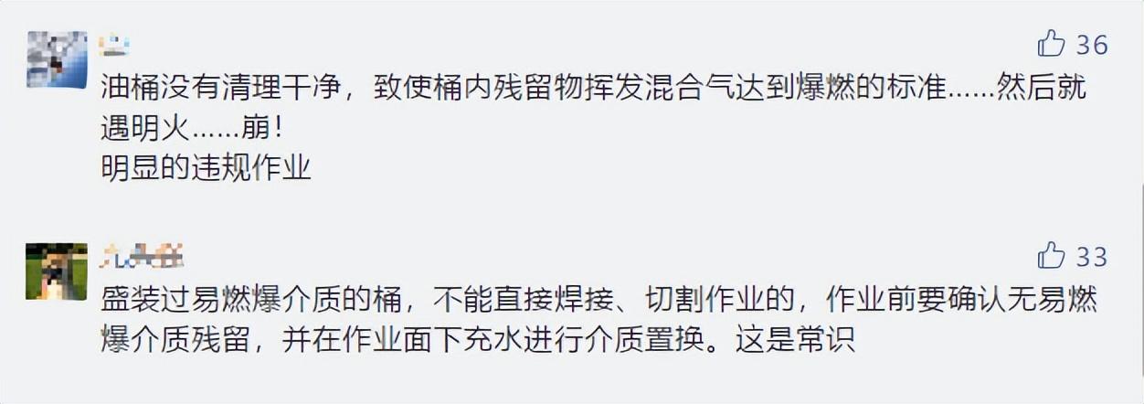 车用汽油的爆炸极限为0.89%~5.16%,爆炸下限非常低。因此,尽管空桶是干的,但只要油桶内壁的铁锈表面微孔吸附少量残油,或桶内卷缝里的残留甚至油污挥发扩散的汽油整齐,很容易达到甚至超过爆炸下限,遇焊接火焰或电弧就会发生爆炸,加上能打开的孔洞盖子没有的打开,爆炸时威力就会更大。
