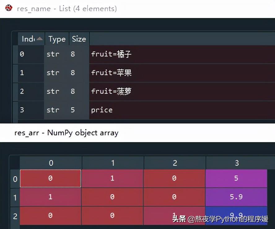 # 字典特征抽取from sklearn.feature_extraction import DictVectorizerfruits = [{'fruit':'苹果','price':5},{'fruit':'橘子','price':5.9},{'fruit':'菠萝','price':9.9}]# vect接收字典特征提取方法vect = DictVectorizer()# 提取特征,并变成sparse矩阵res = vect.fit_transform(fruits)# 转换成数组,看得更清晰res_arr = res.toarray()# 获取sparse矩阵的特征名res_name = vect.get_feature_names()# 特征名为'橘子''苹果''菠萝''price'0代表橘子,1代表苹果,2代表菠萝,列表的第一个字典中的fruit是苹果,因此0和2索引对应的数值为0,即不是橘子和菠萝,同理列表的第2和3个字典。通过字典特征抽取,将文本数据转变成数值类型数据。