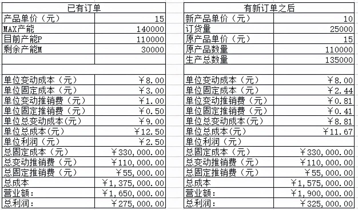 不接新订单只有27.5W利润,接了新订单后利润是32.5W。这多出来的5万利润就是新订单的贡献。