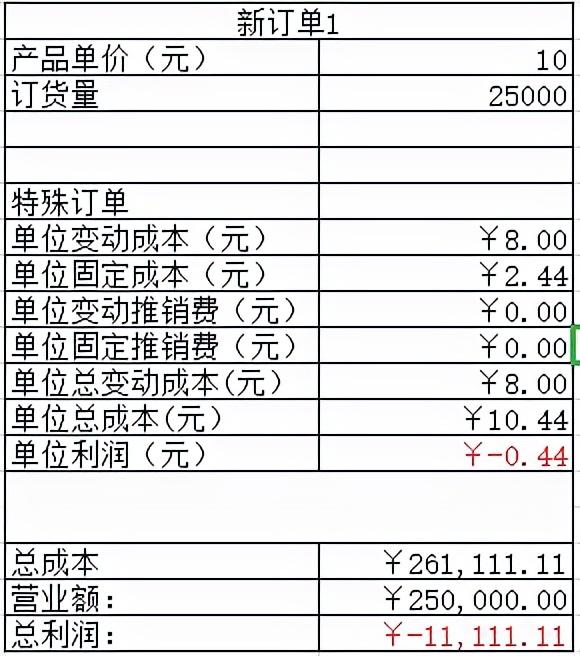 算下来新订单的总成本是10.44元,售价是10元。所以单位利润是-0.44元。也就是说,生产1件产品亏损0.44元。