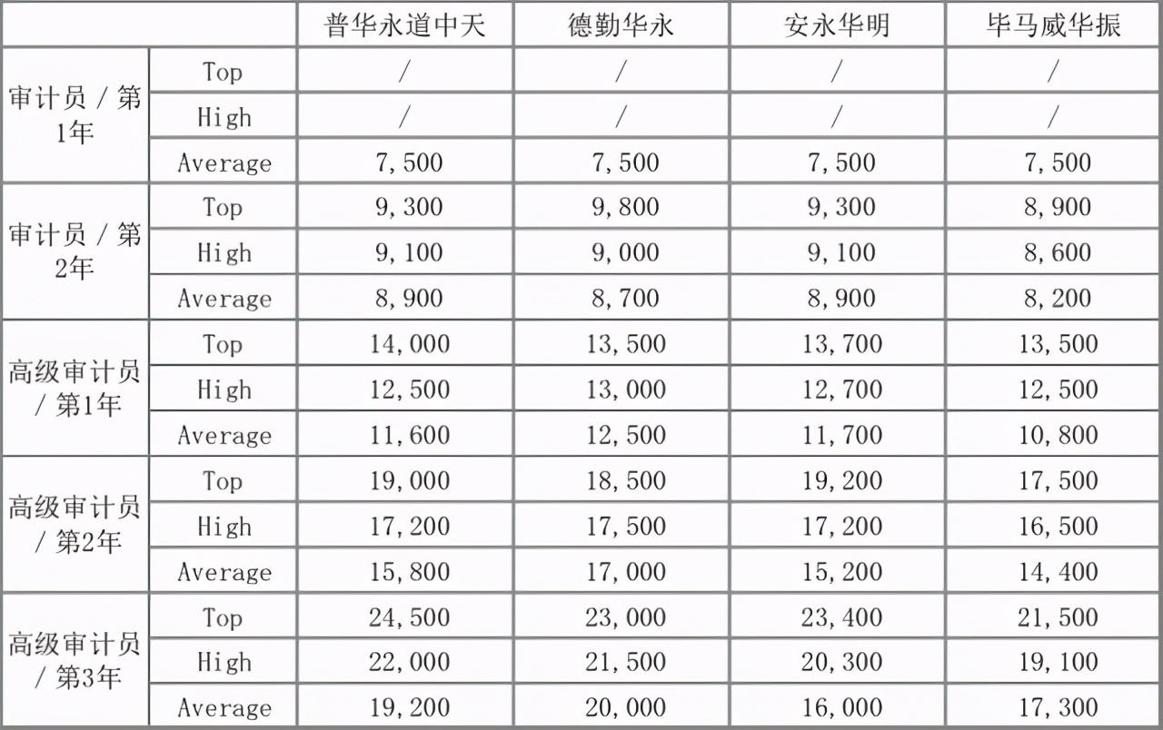 【审计部门】初级审计师(从业年限1-2年):初级审计师是应届毕业生进入四大后的第一个职级,通常需要从业满两年且考核合格后可升为高级审计师(Senior Associate)。